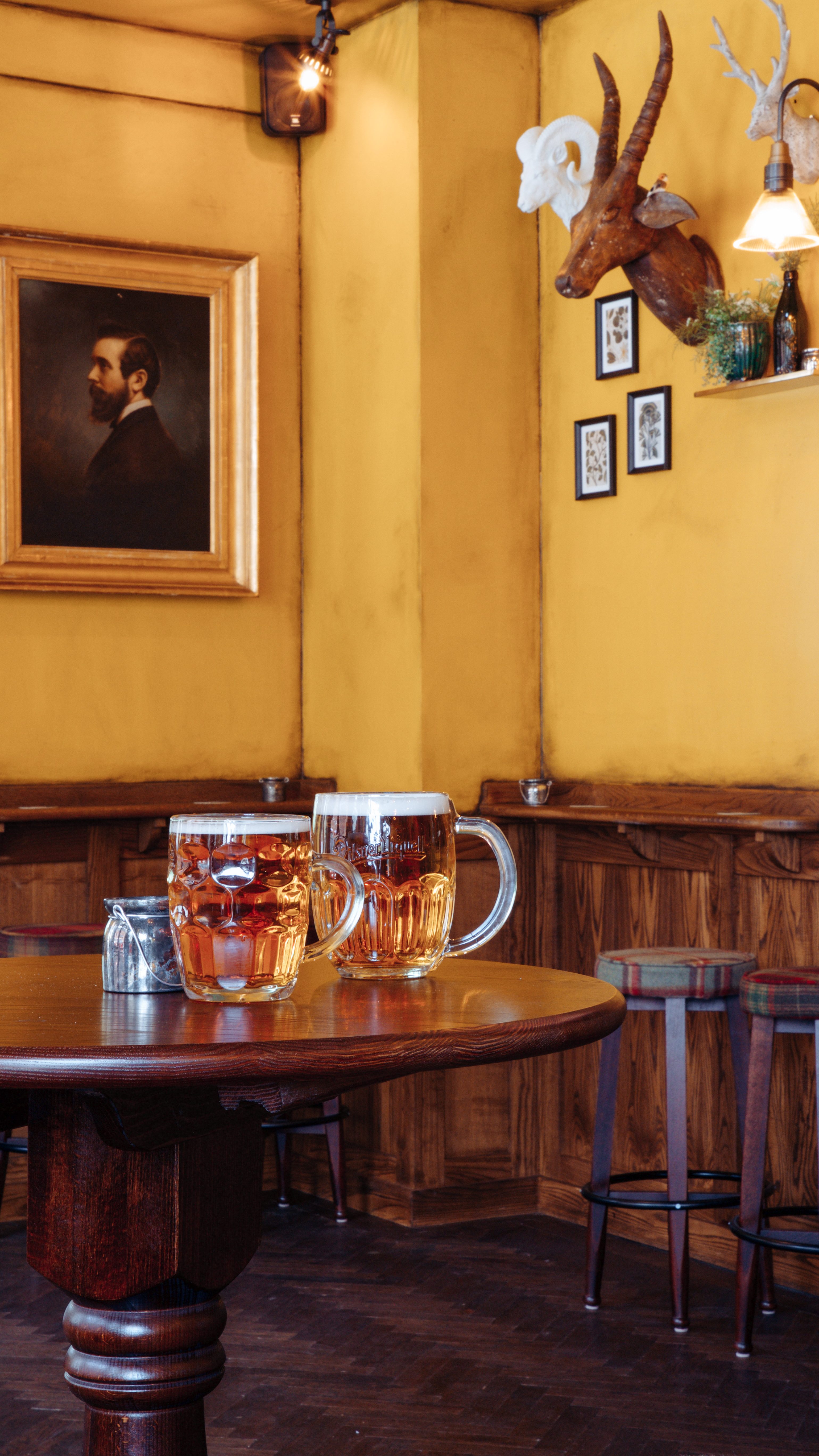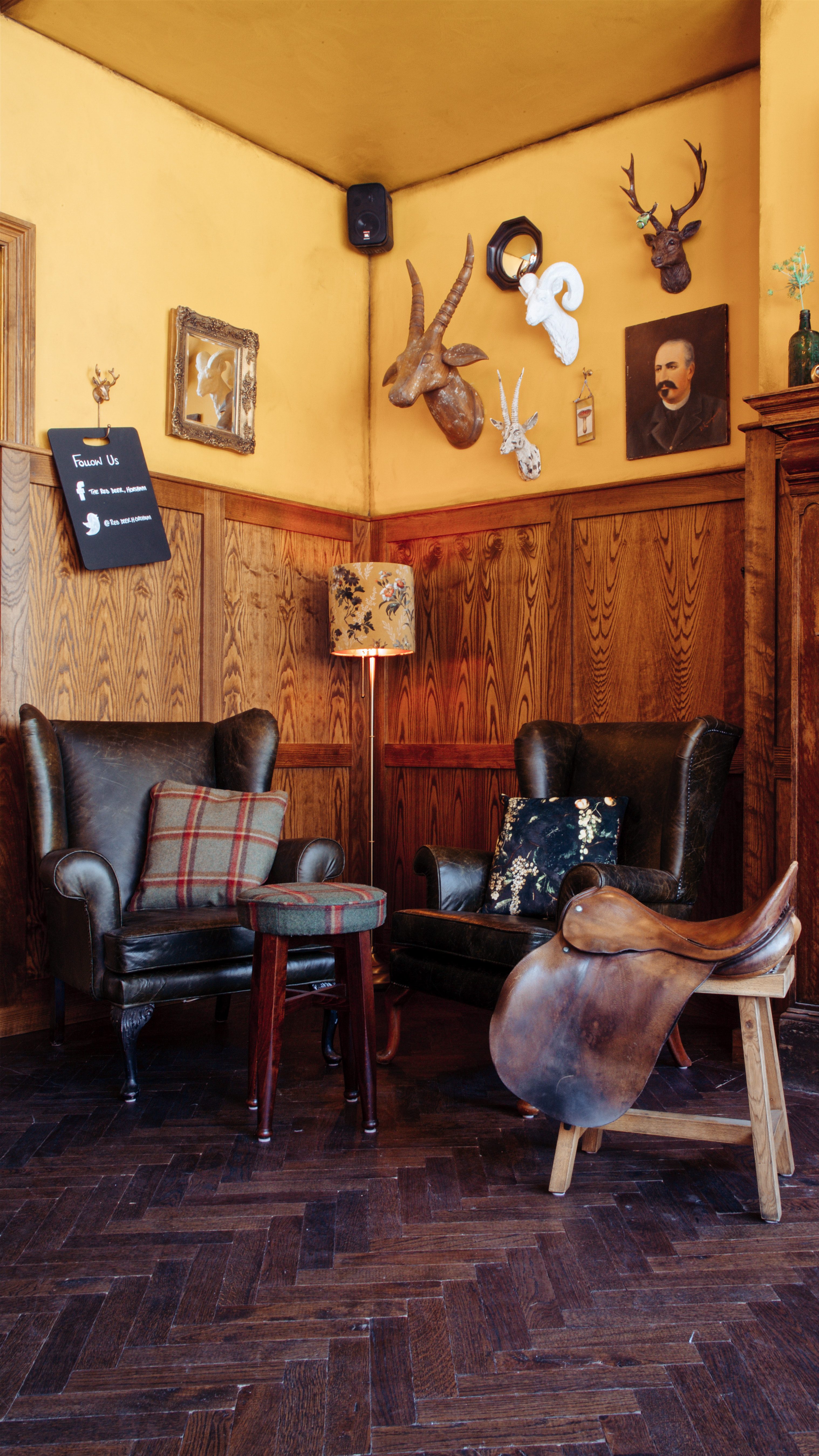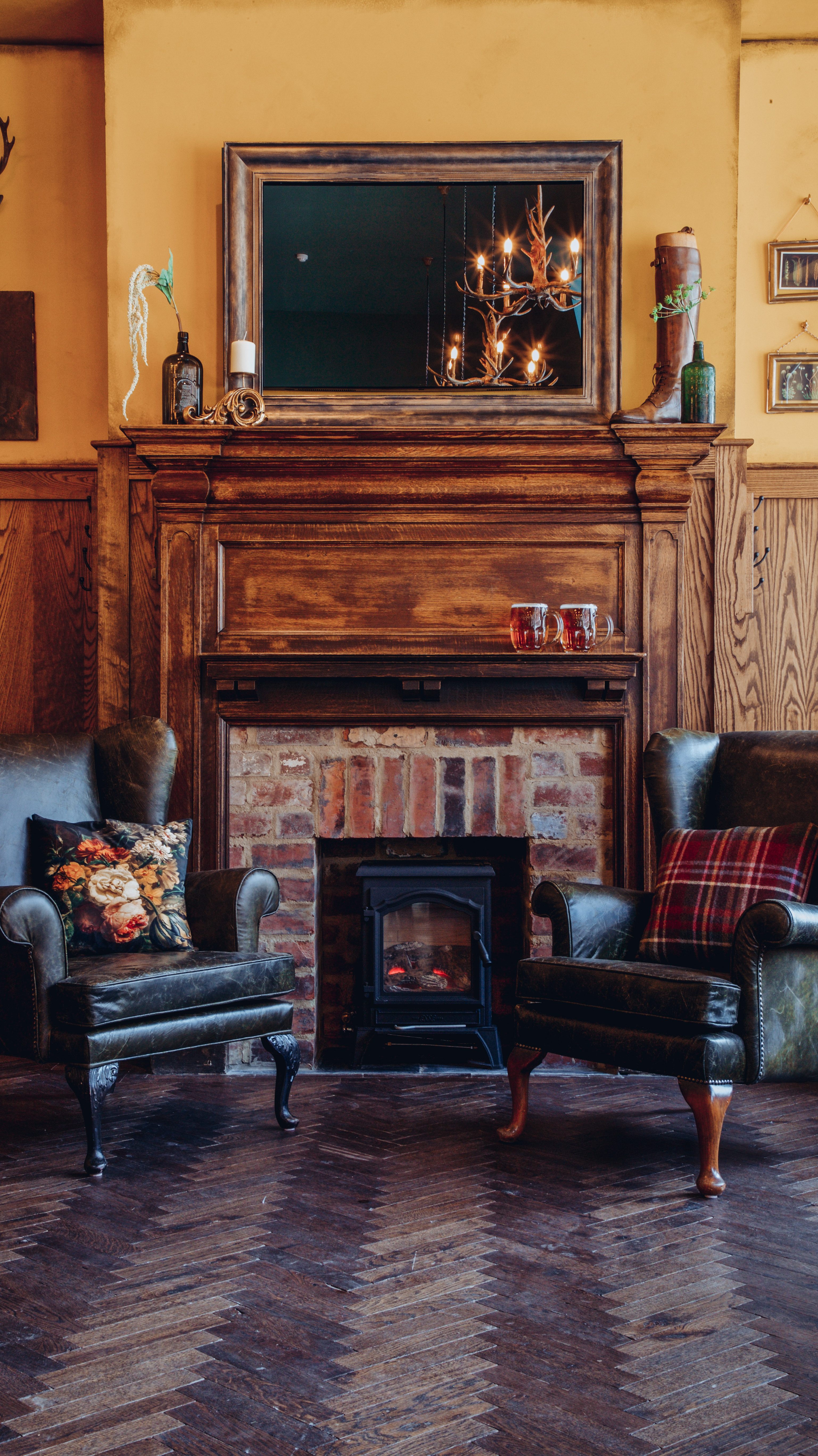I particularly loved the bar treatment which combined reclaimed parquet flooring, lacquered ochre walls, dark oak panelling and a reclaimed fireplace and copper ale tanks to fantastic effect.